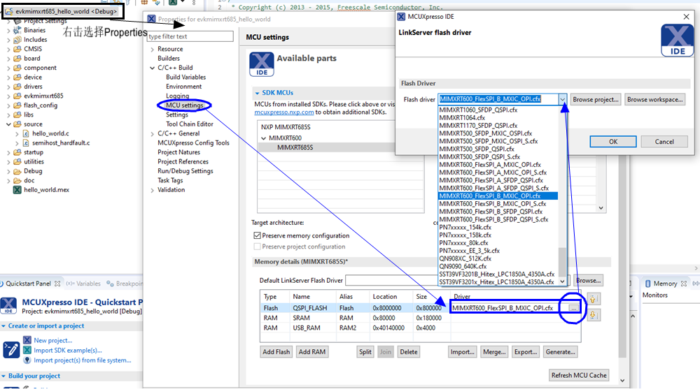 现在我们随便打开一个i.MXRT600 SDK工程,右击工程进入Properties设置界面,在MCU Settings下可以看到LinkServer Flash Driver的设置界面,这里就是选择flash下载算法。MCUXpresso IDE默认自带了非常多的flash下载算法(文件后缀名是.cfx,其实就是可执行文件elf),即使是同一颗芯片RT600,可以看到其有很多个.cfg可选,这分别对应了不同的flash种类以及与主芯片连接端口。