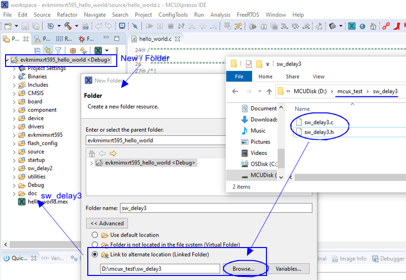 最后介绍一种最复杂的情况,这次不在工程路径\mcux_test\evkmimxrt595_hello_world下做文章,我们在\mcux_test\路径下新建一个名为sw_delay3的文件夹,并且将sw_delay3.c/h文件放到\mcux_test\sw_delay3\路径下。因为这个新路径跟工程路径不相关,因此工程workspace没有自动显示它,此时当然需要我们手动来添加这个文件夹进工程。右击工程选择 New / Folder,使用Folder选项里Advanced下面的 Link to alternate location 功能将sw_delay3文件夹及其源文件添加进工程。