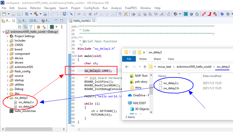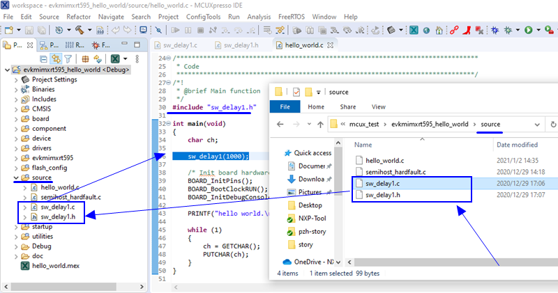 第一种测试情况最简单,我们直接把sw_delay1.c/h文件放到\mcux_test\evkmimxrt595_hello_world\source\路径下,跟主函数源文件hello_world.c放在一起。当我们将新源文件放到已有路径下时,在MCUXpresso IDE工程里新文件就立刻显示在了界面左上角的workspace里(可以理解为直接被添加进工程了),根本不用你手动添加(这是跟IAR/MDK相比第一个不同的地方,也是你可能不适应的地方),这时候我们可以在主函数文件里直接引用和调用sw_delay1.c/h里的内容,不需要再额外做任何工程设置。