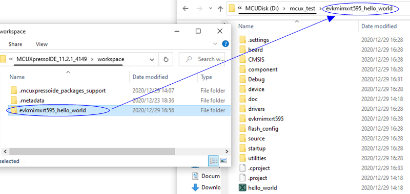 上篇文章 《MCUXpresso IDE下SDK工程导入与workspace管理机制》 里我们导入了RT500的一个hello world项目进workspace空间,让我们将这个项目拷贝到如下自定义的路径,然后在MCUXpresso IDE下使用 Import project(s) from file system 方式并且不勾选 Copy projects into workspace 选项去打开自定义路径下的hello world工程。