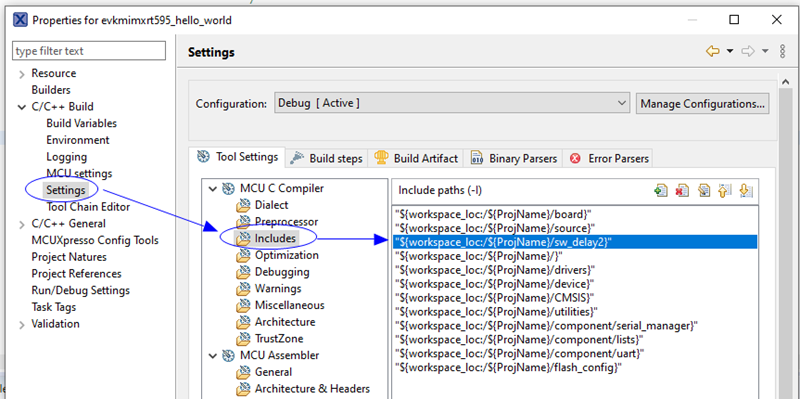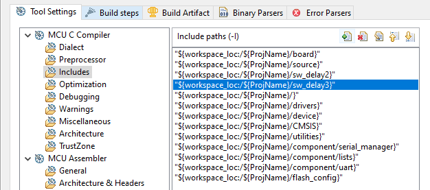 现在我们换一种情况,还是在当前工程路径\mcux_test\evkmimxrt595_hello_world下,但是新建一个名为sw_delay2的文件夹,并且将sw_delay2.c/h文件放到\mcux_test\evkmimxrt595_hello_world\sw_delay2\路径下。因为有了新路径,此时还需要在工程Properties选项的MCU C Compiler / Includes里(最好在MCU Assembler / General 里也同样设置)将该新路径添加进去。