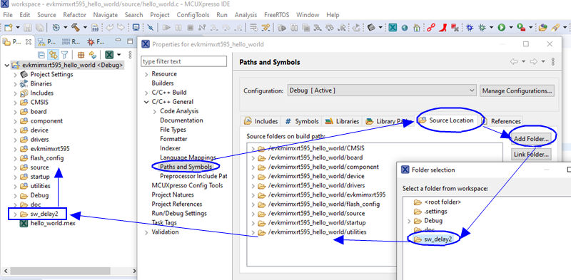 此时工程workspace中已经显示了sw_delay3文件夹,但是显示在最下面(Debug和doc之后),这时候我们可以当sw_delay3文件夹刚刚被放到\mcux_test\evkmimxrt595_hello_world\下面一样,按3.1节里的方法走一遍,MCU C Compiler / Includes和C/C++ General - Paths and Symbols下都分别再设置一下。