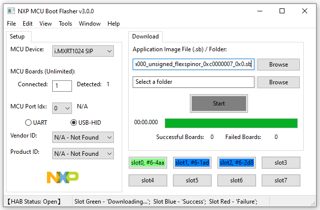 NXP-MCUBootFlasher v3.0版本实现了真正的异步烧写多块板卡的设计逻辑:n块板卡不需要同时被连上PC插槽,每个插槽均由一名工人负责,工人将板卡连上插槽,工具会自动完成该板卡的下载工作(不需要点击任何按钮),并给出最终下载状态结果,下载完成工人即可更换下一块板卡,重复此过程。n路插槽的n个工人可以根据自己工作节奏来做,不需要严格同步,其本质上是并行的,这种设计才是产线上的真实操作流程。
