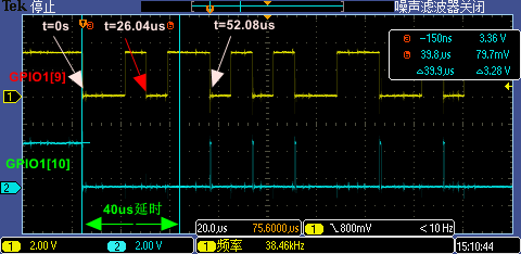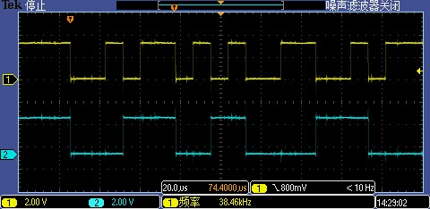 中断处理函数代码改进之后再次用示波器抓取波形,测试结果就正常了: