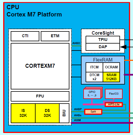 《普通GPIO与高速GPIO差异及其用法》 一文里讲了,普通 GPIO 时钟源是 IPG Bus,而 HSGPIO 时钟源是 AHB Bus,因此测试工程里 AHB/IPG 时钟配置会影响最终 I/O 翻转极限频率。下图是 i.MXRT1060 内核结构里的 HSGPIO 通路。