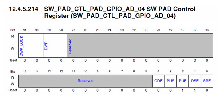 特别提醒的是在 i.MXRT1170 IOMUXC 模块 SW_PAD_CTL 控制寄存器里取消了 SPEED 配置,并且 DSE 配置也从 3bit 减少到 1bit,这点跟 i.MXRT1010/1060 上设计不一样: