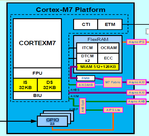 《普通GPIO与高速GPIO差异及其用法》 一文里讲了,普通 GPIO 时钟源是 IPG Bus(在 i.MXRT1170 里叫 BUS_CLK),而 HSGPIO 时钟源是 AHB Bus(在 i.MXRT1170 里叫 M7_CLK),因此测试工程里 AHB/IPG 时钟配置会影响最终 I/O 翻转极限频率。下图是 i.MXRT1170 内核结构里的 HSGPIO 通路。