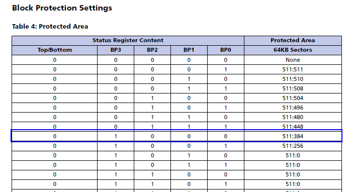 再进一步往下找 BP[3:0] 设置与 Flash 空间对应关系,发现 4'b1000 设置就是保护后 1/4 区域里的所有 block,至今似乎真相大白了。为了验证发现,我们需要将 Status Register 重设为 0x00,然后再用 J-Flash 烧写一次,这时候校验失败问题消失了,一切恢复正常。