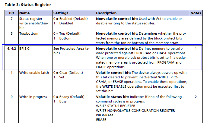 第二小节介绍里我们知道 Micron Flash 是没有 QE 位设计的,因此 flexspi_nor_enable_quad_mode() 函数在这里是多余的,这个函数是将 0x40 写入到了命令标号为 0x01 的 Status Register(这个操作适用于 ISSI Flash),我们在数据手册里找到这个寄存器定义,发现被置位的 bit 6 是块保护控制位 BP[3:0] 里的最高位,并且 BP[3:0] 设置是非易失性的(断电不丢失)。