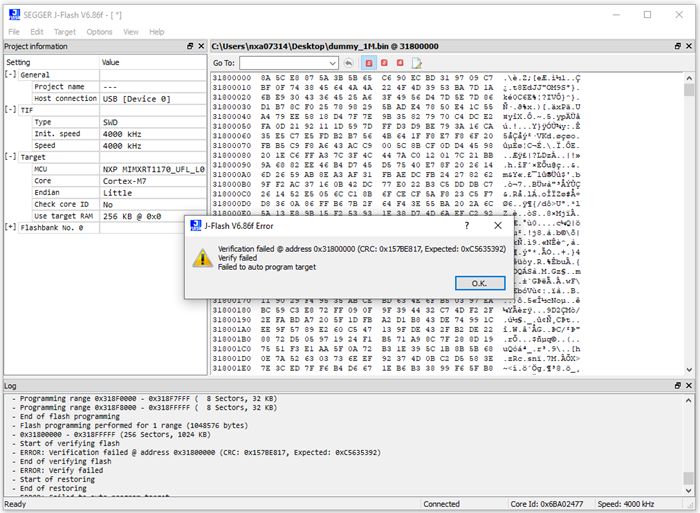 接下来就是按客户操作流程来复现 Segger J-Flash 烧写校验失败问题,客户其实是尝试烧写全部 32MB 数据来查看 J-Flash 及其配套下载算法能否适用这颗 Flash,这里痞子衡就用 《超级下载算法RT-UFL v1.0》,经过测试,确实复现了客户的问题。经过反复测试,定位了问题是这颗 Micron 32MB 的 Flash 前 3/4 区域(0x0 - 0x17FFFFF)是没问题的,但是在后 1/4 区域(0x1800000 - 1FFFFFF)均会出现校验错误(J-Flash软件里看擦写操作是能进行的,但后面发现其实根本没有正常擦写)。