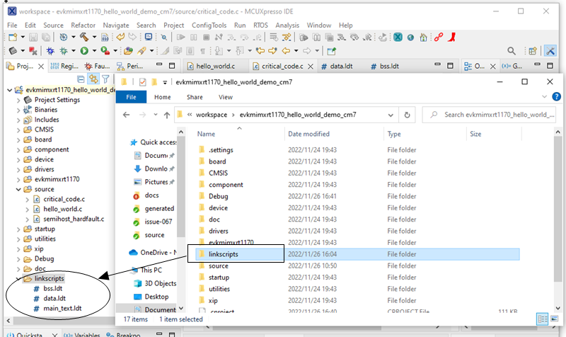 现在我们尝试用 FreeMarker 特性来解决 critical_code.o 的链接需求。首先是在 \MCUXpressoIDE_11.6.0_81874\workspace\evkmimxrt1170_hello_world_demo_cm7 下创建一个名为 linkscripts 的文件夹(前面说了,这个新文件夹路径不需要在工程选项里登记),然后在 linkscripts 里面新建如下三个 .ldt 文件(固定文件名,由 FreeMarker 定死的):