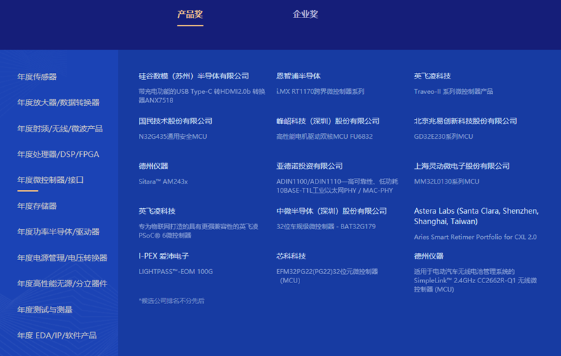 其中产品奖共有 11 个分类,大家有空可以去看看,可以通过这次评选了解到电子行业都有哪些公司推出了哪些产品。在年度微控制器/接口下,有痞子衡一直在支持的恩智浦 i.MXRT1170 系列,还望大家帮忙投个票。
