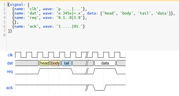 WaveDrom 是一个免费开源的在线数字时序图渲染引擎。它可以使用 JavaScript, HTML5 和 SVG 来将时序图的 WaveJSON 描述转成 SVG 矢量图形,从而进行显示。WaveDrom 可以嵌入到任何网页中。