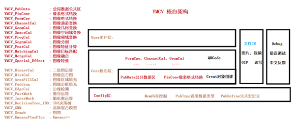 YMCV 项目分为三层架构,顶层是用户层,它是对核心层的包裹,方便用户对它进行调用,核心层的内容为左边那列内容,其中黑体的 QRcode 是二维码相关的编码和解码功能,这部分作者是将第三方库进行了压缩打包,底层 congfig 是配置信息,内存管理以及 IO 文件接口的定义。