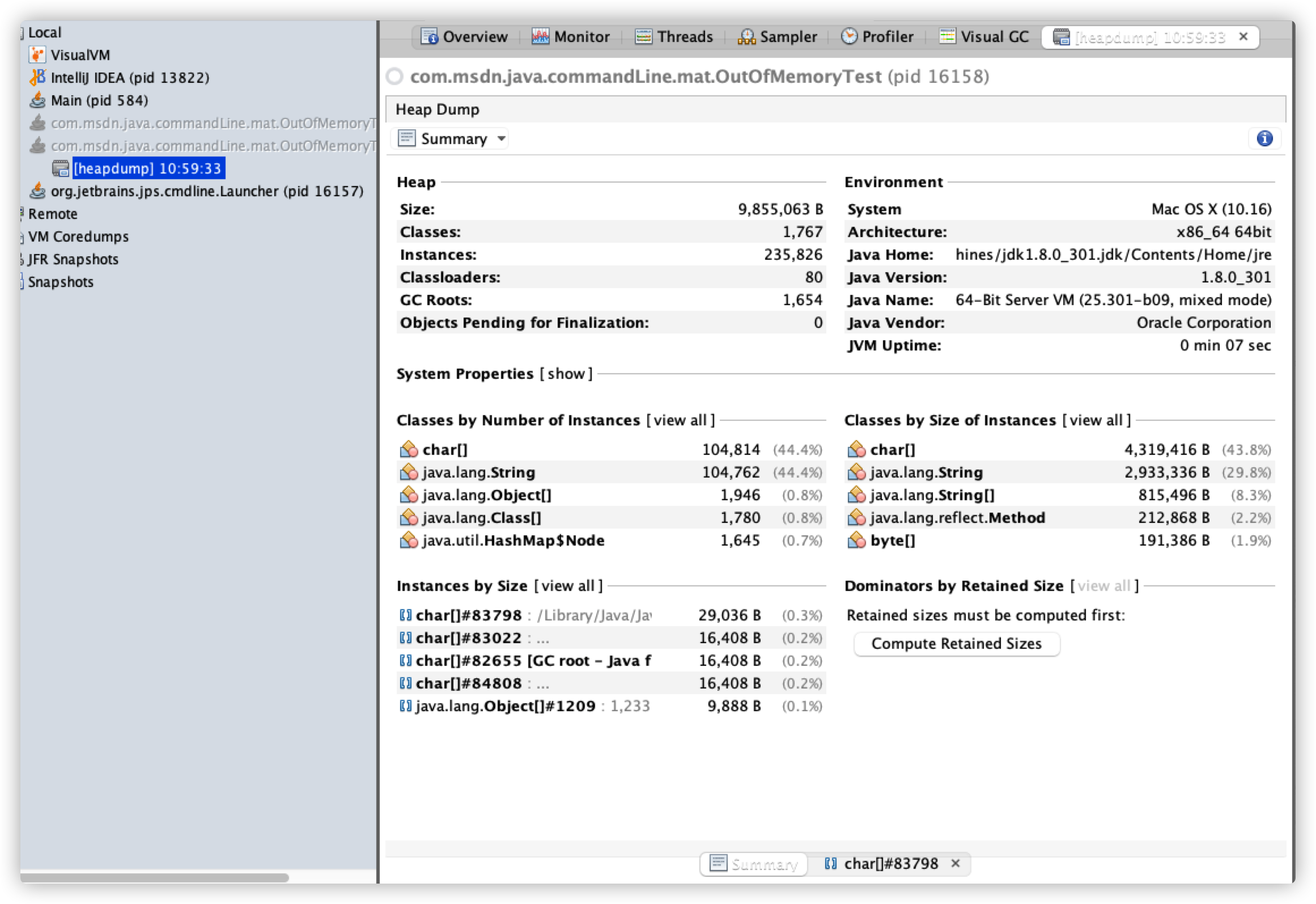 在上述页面还可以进行很多操作,比如点击“Classe上 by Size of Instances”下的 char[],进入详情页。