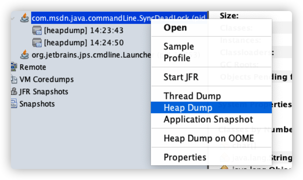 上述堆 dump 还可以通过这种方式查看,右键菜单中的 “Heap Dump“,