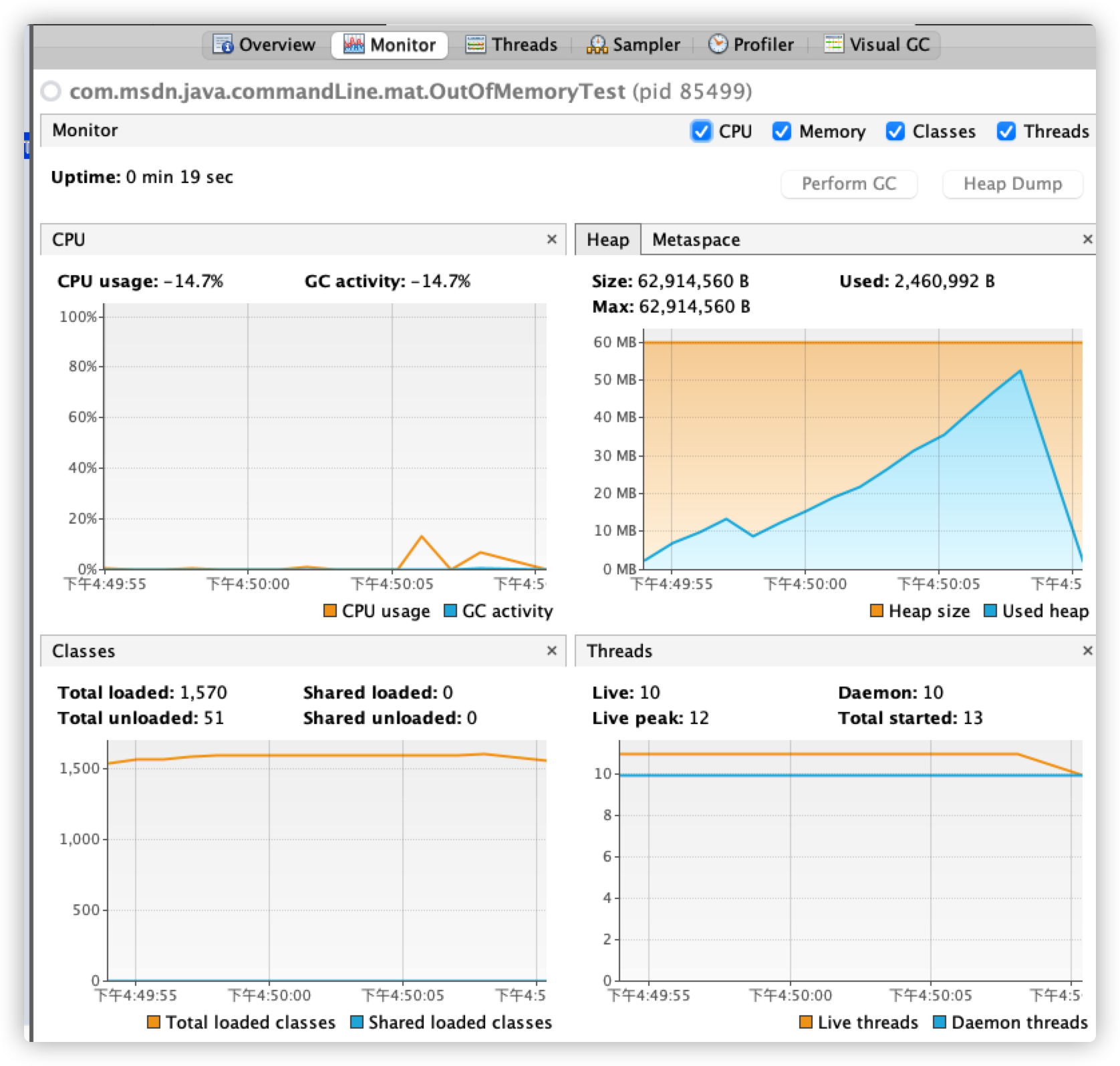 还是继续使用上文的本地案例,执行上述程序,在 VisualVM 页面左侧双击程序对应的进程,首先进入 Overview 页面。
