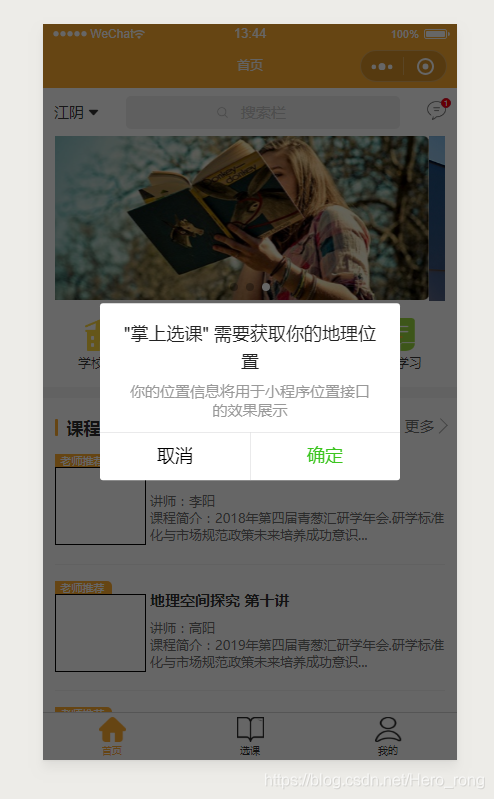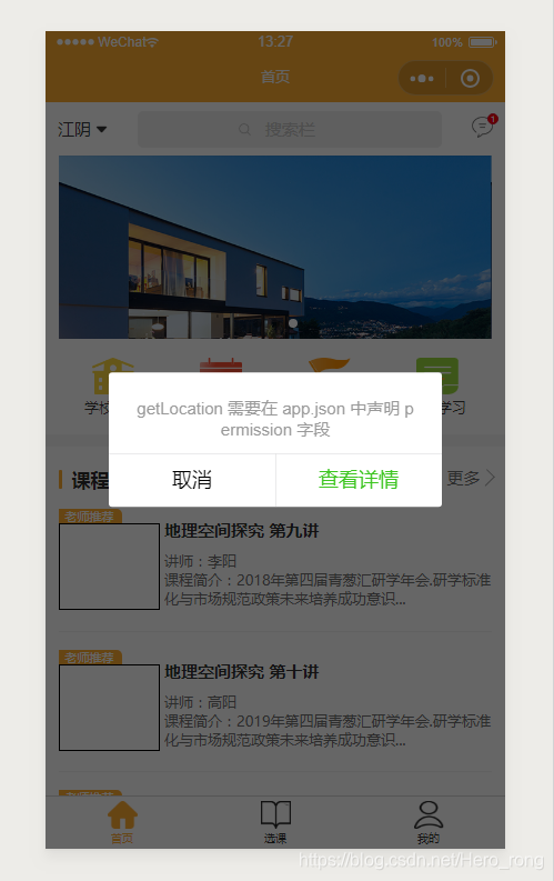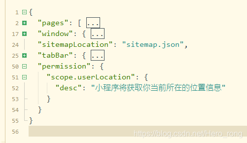 如果你直接简单这么写的话,就会报错,解决方法在app.json里面配置permission,其中desc属性是用来介绍获取位置是用来干嘛的,如果不填的话,会接着报上面的错,我这个是在微信开发工具上截的图片,真机上是在下面的,样式比这个好看些
