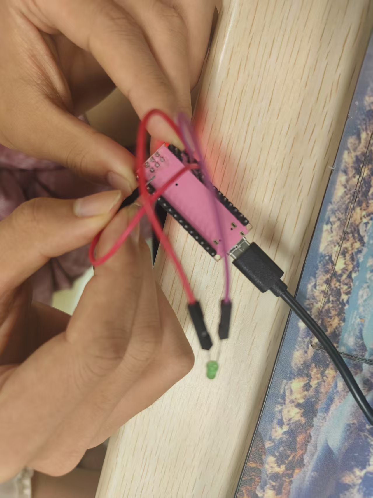 利用两根母对母杜邦线进行LED灯与开发板的连接。