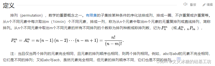 排列,一般地,从n个不同元素中取出m(m≤n)个元素,按照一定的顺序排成一列,叫做从n个元素中取出m个元素的一个排列(permutation)。特别地,当m=n时,这个排列被称作全排列(all permutation)。