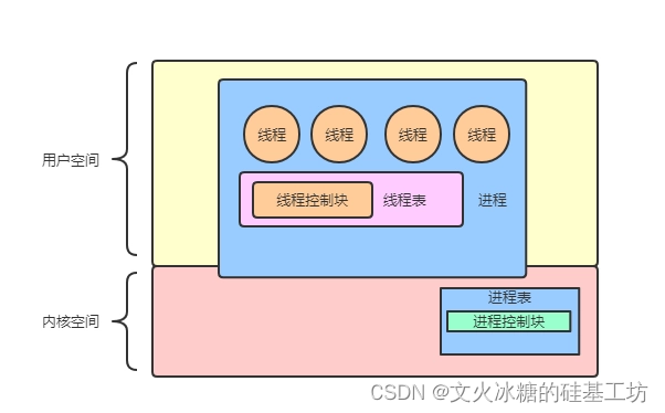 - 线程的创建和销毁由进程内的线程库负责,例如pthread库。线程的调度通常由内核的线程调度器负责。