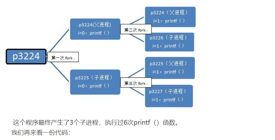 对于子进程p3225,执行完第一次循环后,i=1,接着执行fork,系统中新增一个进程p3227,对于此进程,p3224->p3225(当前进程)->p3227(被创建的子进程)。从输出可以看到p3225原来是p3224的子进程,现在变成p3227的父进程。父子是相对的,这个大家应该容易理解。只要当前进程执行了fork,该进程就变成了父进程了,就打印出了parent。