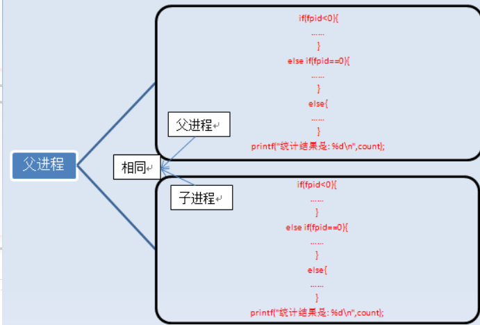 在语句fpid=fork()之前,只有一个进程在执行这段代码,但在这条语句之后,就变成两个进程在执行了,这两个进程的几乎完全相同,将要执行的下一条语句都是if(fpid<0)……