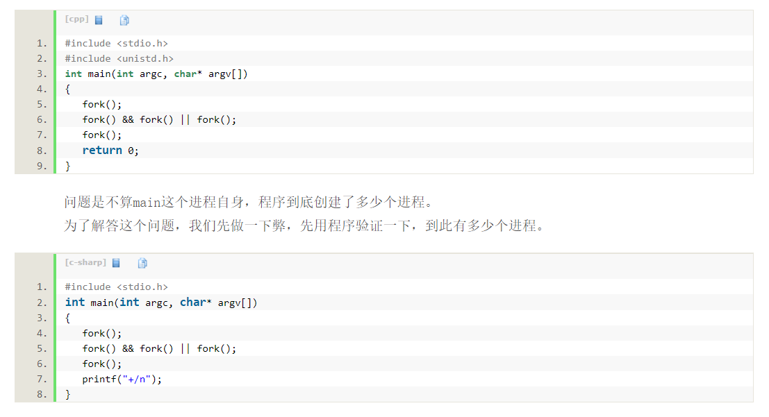 总结一下规律,对于这种N次循环的情况,执行printf函数的次数为2*(1+2+4+……+2N-1)次,创建的子进程数为1+2+4+……+2N-1个。(感谢gao_jiawei网友指出的错误,原本我的结论是“执行printf函数的次数为2*(1+2+4+……+2N)次,创建的子进程数为1+2+4+……+2N ”,这是错的)