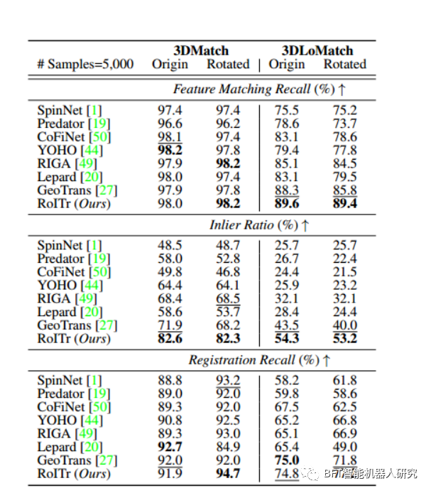 表1展示了在旋转和非旋转的3DMatch和3DLoMatch数据集上的定量结果。