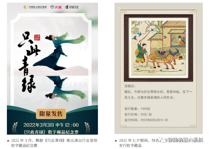 基于数字藏品题材的包容性,文化遗产、音乐、影视、画作、表情包等各类文化创意资源都可以转化为数字藏品,以更年轻潮流的方式传递文化价值。同时,数字藏品能够打破时空局限,让文化艺术的观赏和收藏进一步走向大众化,推动大众对传统文化形成更多的关注与理解。2022年,舞剧《只此青绿》、陕西凤翔木版年画《天河配》推出数字藏品后,均受到广泛欢迎,构建出传统文化IP触达观众的新方式,也展现了中华优秀传统文化IP的新生命力。