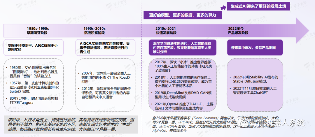AIGC的技术不是2022年才突然出现,而是随着Al技术送代而出现,早期主要是受制于算法、算力及信息数字化的程度(数据信息的成本)。