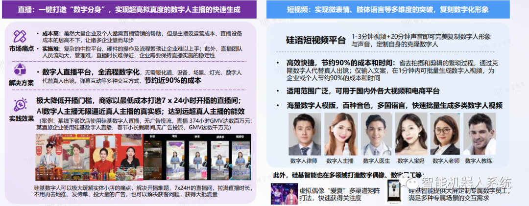 场景落地:数字人直播平台和硅语短视频平台,广泛应用于本地生活直播、电商直播带货、企业家1P、医生1P、师IP、个人IP、直播电商、跨境电商等领域,适用抖音、快手、视频号、淘宝、天猫、拼多多、京东等国内视频、电商全平台,也支持海外视频平台如TikTok、Ins、Facebook、YouTube等。