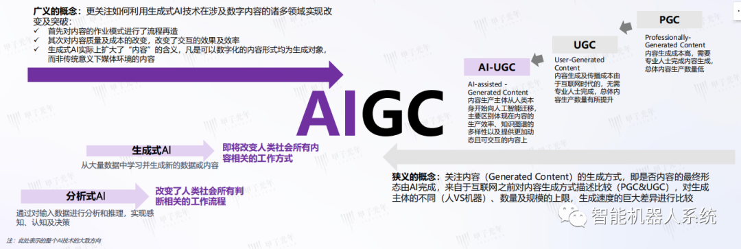 目前广受热议的AIGC实际是对此次AI技术变革的一种描述。概念AIGC(或者说以硅为基本构成的计算机)具备了人类社会中内容生成概念的能力,而不是随意生成人类社会共识下无法理解的文字、语句、图片、人像、视频等等。AIGC概念具备狭义和广义区别,狭义概念更强调内容属性,广义概念强调AI的技术属性。狭义的概念重点关注的是数字内容的生产形式和人力生成内容方式对比,例如图片、文字、视频等常规内容形式如何一步通过AI生产。