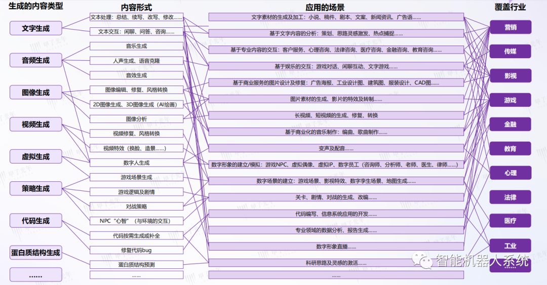 AIGC的能力来源于内容生成的多种类型,辐射多个应用场景及行业