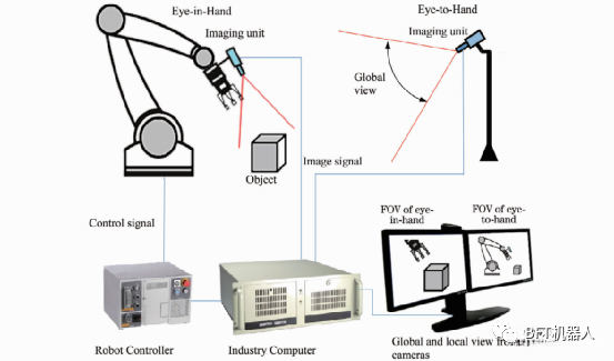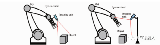 在工业应用领域,最具有代表性的机器人视觉系统就是机器人手眼系统。根据成像单元安装方式不同,机器人手眼系统分为两类:固定成像单元眼看手系统(Eye-to-Hand)和随动成像单元眼在手系统(Eye-in-Hand or Hand-Eye)。