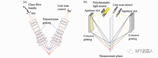 图:两种色散共焦线扫描成像方案(a)色散共焦显微镜;(b)色散共焦三角法
