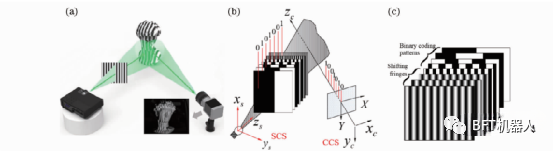 图:多次投影3D成像(a)多次投影3D系统机构示意图;(b)二进制格雷码投影3D基本原理;(c)二进制格雷码+正弦相移混合编码投影3D