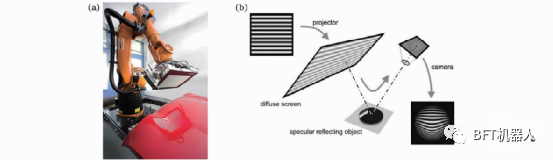 偏折法成像:对于粗糙表面,结构光可以直接投射到物体表面进行视觉成像测量;但对于大反射率光滑表面和镜面物体3D测量,结构光投影不能直接投射到被测表面,3D测量还需要借助镜面偏折技术。