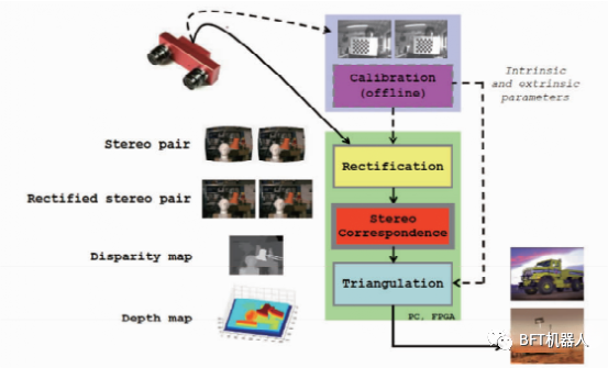双目视觉深度感知视觉线索有:眼睛的收敛位置和双目视差。在机器视觉里利用两个相机从两个视点对同一个目标场景获取两个视点图像,再计算两个视点图像中同名点的视差获得目标场景的3D深度信息。典型的双目立体视觉计算过程包含下面四个步骤:图像畸变矫正、立体图像对校正、图像配准和三角法重投影视差图计算。