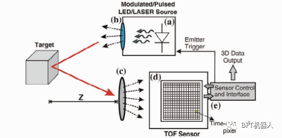 飞行时间(TOF)相机的每个像素利用光飞行的时间差来获取物体的深度。