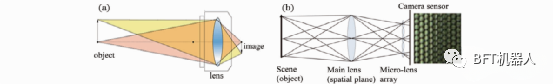 图:光场相机成像与传统相机成像对比(a)传统相机成像原理;(b)光场相机结构与成像原理