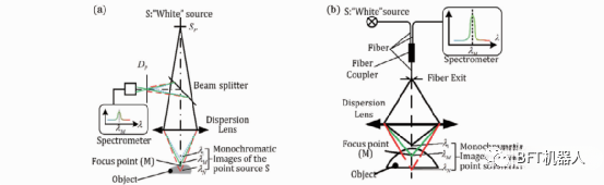图:两种色散共焦单点测距方法(a)基于小孔和分光镜的结构;(b)基于Y型光纤分光的结构