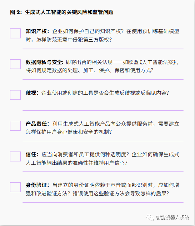 生成式人工智能的快速采用为所有企业提出了新的紧迫工作: 建立一套稳健、负责任的人工智能合规体系。这包括两方面的事项一-建立控制流程,在设计阶段评估生成式人工智能应用方式的潜在风险 ;制定明确措施,在整个业务中嵌入负责任人工智能方法。埃森哲的研究表明,大多数企业仍任重而道远。我们 2022 年面向全球 850名高管人员的调研显示,受访者普遍认识到了负责任人工智能和人工智能监管的重要性。但仅有6% 的企业认为,自身已打造了充分稳健的负责任人工智能基础。