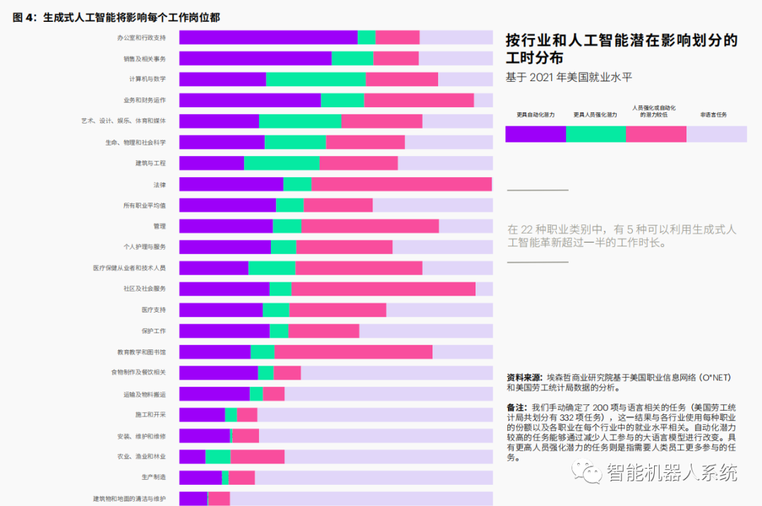 几乎所有的工作都会受到影响,而许多新型工作亦将不断涌现。企业若能立即采取措施,将工作拆分为任务,并投资培训员工与机器协作,以不同以往的方式开展工作,那么将实现绩效飞跃,远超短视对手。
