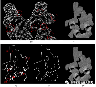 图3 对“边界点”噪声进行滤波:(a) 具有“边界点”的点数据集;(b) 没有“边界点的紧凑点数据;(c) “边界点”;(d) “边界点”被进一步填充为特征点;(e) 图3(d)特征点与图3(b)特征点相加的结果