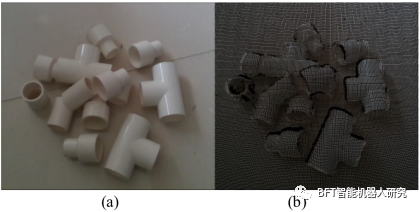 图1 工作台上三通管摆放不整齐。(a)工件的RGB图像。(b)图1(a)三维数据点集。