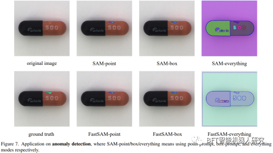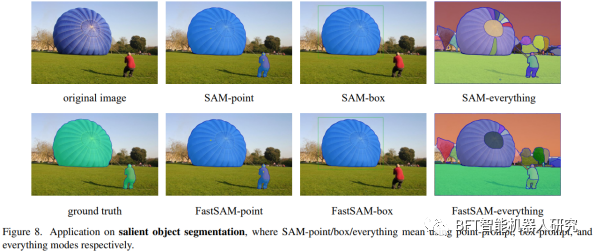 1. 文章中展示了使用点提示、框提示和everything模式下的Fast-SAM分割的可视化结果,并将其与SAM和真实标注进行了比较。