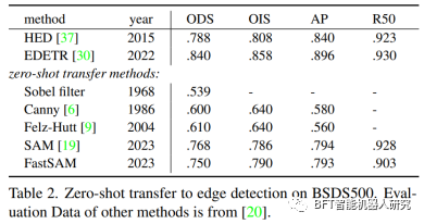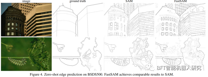 2、在BSDS500数据集上进行的零样本边缘预测实验,并将Fast-SAM的结果与SAM进行了比较。结果表明,Fast-SAM在边界提取任务上取得了与SAM相当的结果。