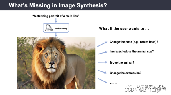 虽然生成式AI已经能够非常好地根据文字生成图片,但是实现更高级的图像微调仍然面临挑战。比如,我们可以把一段话术输入到Midjourney或者Stable Diffusion中,让它生成一个逼真的狮子。但是很多时候,创作的过程并不会在这里结束。