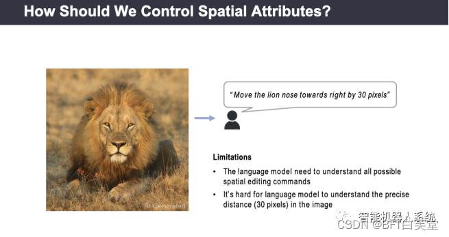 为了实现对物体空间属性的精细控制,我们可以通过沿袭文生图的方法,根据文字的描述编辑图片。目前,学术界已经有一些根据文字来改变图片内容的方法,例如让狮子的鼻子向右移动30像素。但是,这种编辑方式存在一些问题。首先,这种文字编辑需要文本模型的支持,以便理解所有可能的物体空间属性编辑方式。除了向右移动之外,还有许多其他方法可以进行编辑。其次,对于语言模型来说,它实际上很难理解30个像素在当前图像中的精确长度。因此,对于目前的文生图语言来说,精确编辑仍然是一个较大的挑战。